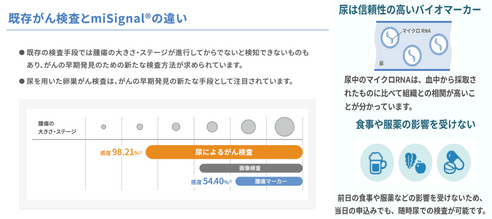 がんに関する臨床研究(問診情報と尿中miRNA情報を統合してAI解析した臨床研究)から、7種類のがん(肺がん、胃がん、乳がん卵巣がん、膵臓がん、食道がん、大腸がん)のリスク判定が可能となり、がんの早期発見のための新たな手段として注目されています。
